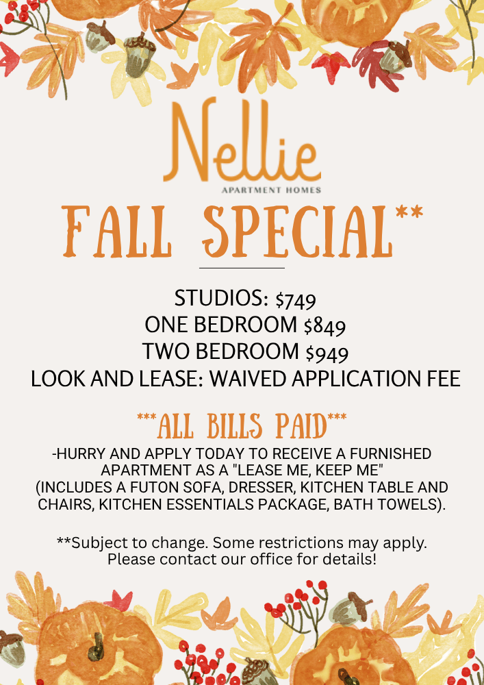 The Nellie is a small community designed just for you. A variety of resident privileges, offering studio, one and two bedroom apartment homes with comfortable interiors.